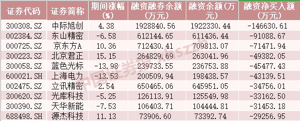 上周融資客對68只股票減倉超1億元,減倉金額居前的10只股票分別為中際旭創(chuàng )、東山精密(002384)、京東方A、北京君正(300223)、藍色光標(300058)、上海電力(600021)、立訊精密(002475)、光庫科技(300620)、天華新能(300390)、源杰科技,分別凈賣(mài)出14.66億元、9.11億元、7.15億元、4.94億元、4.55億元、4.31億元、3.48億元、3.32億元、3.15億元、2.93億元。