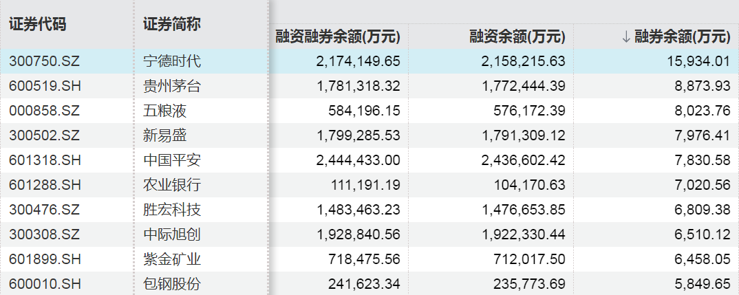 數據顯示,截至12月5日,A股市場(chǎng)融券余額居前的股票分別為寧德時(shí)代、貴州茅臺、五糧液(000858),融券余額分別為1.59億元、0.89億元、0.80億元。