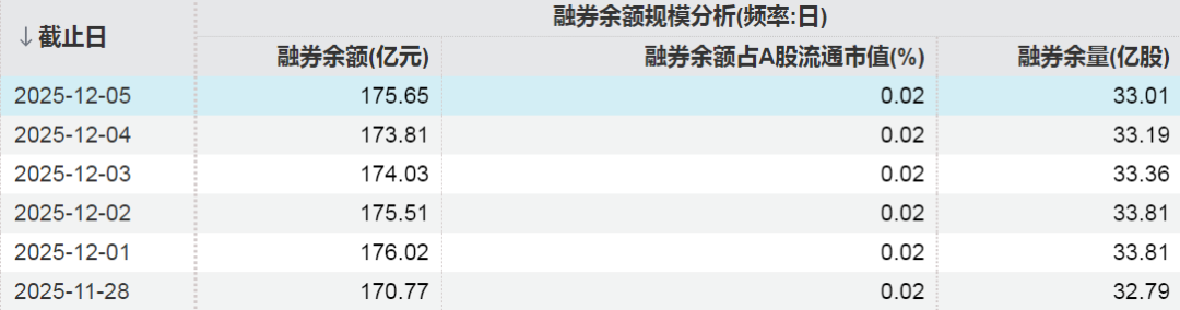 數據顯示,截至12月5日,A股市場(chǎng)融券余額為175.65億元,融券余量為33.01億股。