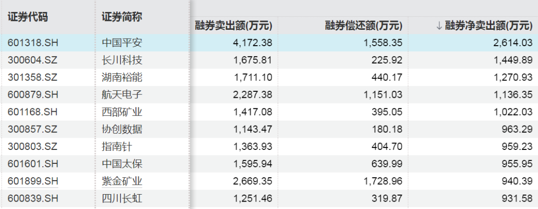 上周融券凈賣(mài)出額前十股票